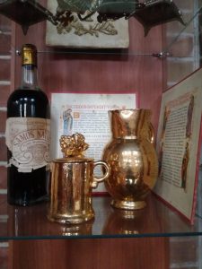 Zo staat er op dit moment op de vitrinekast een reistabernakel. En in de kast uitleg over verschillende scapulieren, canonborden, een godslampje, water- en wijnampul met een fles oude miswijn en nog veel meer.