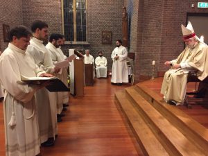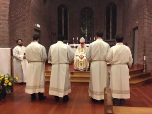 De dienst werd geleid door Jeroen de Wit rector van het seminarie. Samen met de andere wijdelingen, legde Bert zijn geloofsbelijdenis en eed van trouw af in aanwezigheid van bisschop Punt en hulp bisschop Hendriks. Familie, vrienden, collega’s, parochieraad en een aantal parochianen waren allemaal getuige van deze bijzondere viering.