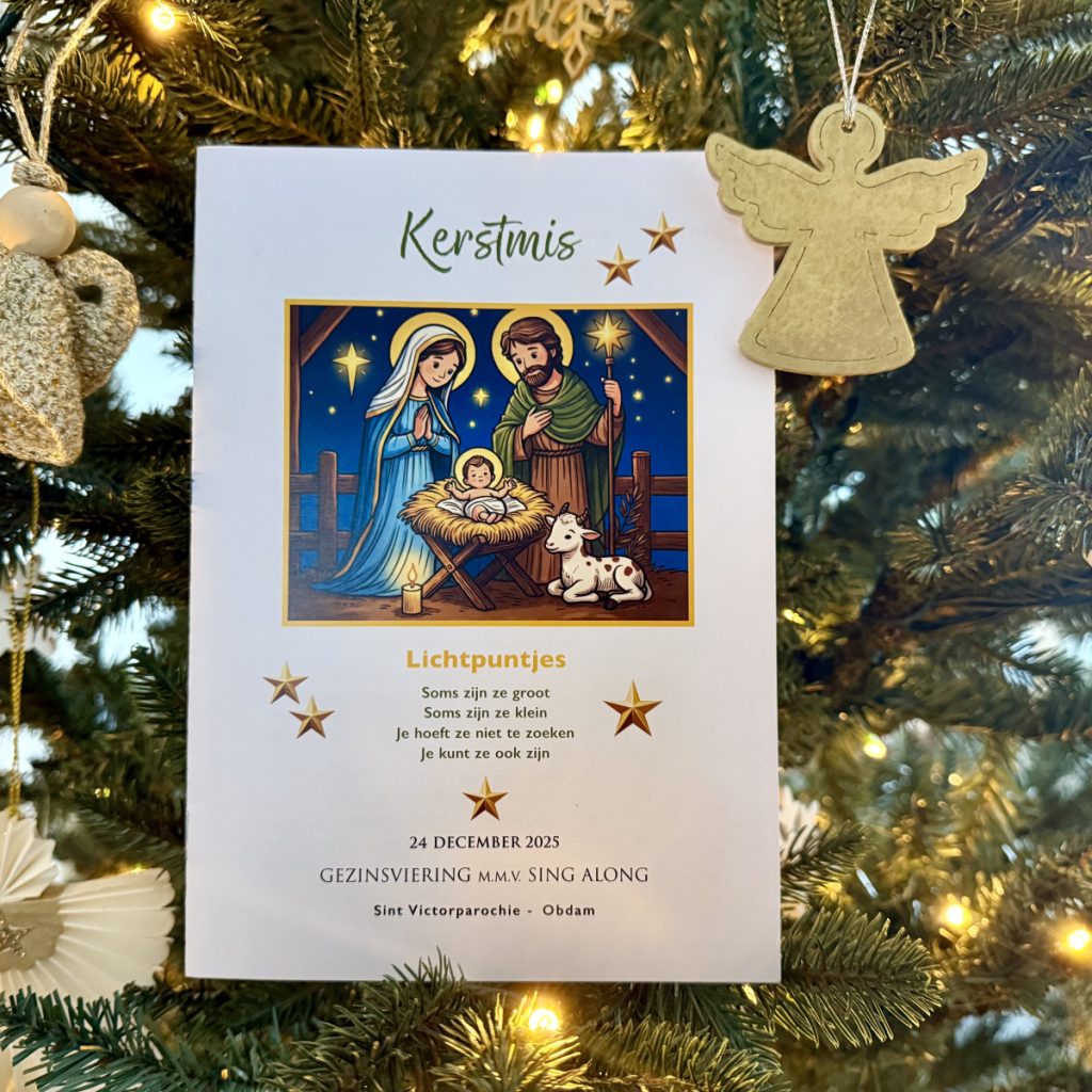 24 december 2025Lichtpuntjes Soms zijn ze groot Soms zijn ze klein Je hoeft ze niet te zoeken Je kunt ze ook zijn! Vanavond om 19.00 uur in de Sint Victorkerk hebben we weer een ouderwets gezellige Gezinsviering. Het kerstthema is: Lichtpuntjes. We hebben 35 kinderen in het gelegenheidskoortje Sing Along die allemaal ontzettend hun best gaan doen. De een zingt de sterren van de hemel, de ander kan nog niet eens lezen… maar het zijn allemaal Lichtpuntjes. We gaan er een prachtige viering van maken. U bent van harte welkom! Met medewerking van muzikanten Valentin en Jos en voorganger Hanneke