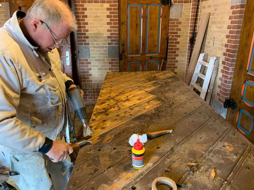 12 april 2021Kerkdeuren Waarschijnlijk is het u opgevallen dat de toegangsdeuren en de zijdeur van onze Sint Victorkerk, zijn vervangen door spaanplaat. In de zijdeur is een nooddeur gemaakt, zodat toch iedereen voor kerkbezoek naar binnen kan. De deuren waren al lang aan een restauratie toe, maar aan alles hangt een prijskaartje. Graag hadden we de opbrengst van De Veiling hiervoor gebruikt, maar langer wachten was onverantwoord. Het hout is op verschillende plekken doorgerot, de verf bladderde af, dus alles moet kaal. En ook het smeedwerk is op verschillende plaatsen door corrosie aangetast en doorgerot. Dit allemaal vereist de nodige vakmanschap. Gelukkig zijn de vakmensen, Jim van de Gracht, Theo Munster en Siem Molenaar bereid om alles weer tot in de puntjes op te knappen. Verlichting kerkklok Maar niet alleen de deuren hadden dringend onderhoud nodig. Ook de verlichting van de kerkklok was aan één kant stuk. Meerdere keren zijn we er op gewezen, maar ook hier hangt weer een prijskaartje aan. De verlichting kan alleen aan de buitenkant gerepareerd worden. Maar wat is dit culturele monument; het boegbeeld van Obdam, zonder goede verlichting! Dus vrijdag 9 april was daar de telescoopkraan met vaste bak. Onze vrijwilliger Gerard Luken heeft als elektrotechnicus de ‘know how’ in huis om de klus te klaren. Vanaf nu kunnen dus alle Obdammers ook ’s avonds weer zien hoe laat het is. Pastorie In de pastorie is de klus bijna geklaard. Op de benedenverdieping worden de laatste deurstijlen, door Wim Butter onder handen genomen. En dan kunnen na maanden hard werken, de vele vrijwilligers met een goed gevoel dit project afsluiten. Het is mooi geworden! Kloosterbel Ook in de gang zijn de veranderingen duidelijk zichtbaar. Er hangt een prachtige kloosterbel met de tekst: ‘Qui me tangit vocem meam audit’. ‘Wie mij aanraakt, hoort mijn stem.’ Heb je pastor Bert nodig? Maak gebruik van deze kloosterbel. Zo weet hij meteen dat er beneden mensen op hem wachten. Tot slot kunnen we zeggen… we gaan gewoon door! Samen maken we er wat van. Parochieraad Sint Victor