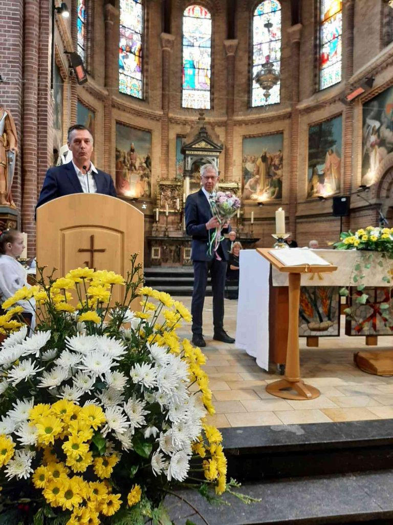 6 april 2021Op paaszondag, waarin we het leven vieren, waren er bloemen voor de voorganger Piet van Baar die met zijn Gerda afgelopen week 50 jaar getrouwd was. Piet heeft een grote staat van dienst in de Marcusparochie en veel voor de regio gedaan. Het is heel fijn dat hij nu voorganger is. Maar normaal geven wij als parochie geen bloemen aan jubilarissen. Deze bloemen staan dan ook symbool voor onze dankbaarheid aan alle vrijwilligers van de Sint Victor parochie. Degenen die hier vandaag de viering mogelijk maken; de zangers, Pierre, de kosters, de misdienaars, de lector maar ook alle vrijwilligers achter de schermen, de schoonmaaksters, de tuinmensen en de leden van de avondwakegroep om er maar een paar te noemen. Het is voor ons allen een lastig jaar geweest in deze coronatijd. Maar met elkaar, met pastor Bert, vrijwilligers, de 30 mensen in de kerk, de luisteraars van de kerkradio en de kijkers van de live-stream, die ook terug te kijken is, houden we onze parochie levend. En dat is belangrijk. Om elkaar, juist nu, figuurlijk vast te houden en te blijven steunen. Ik wens u Zalig Pasen. Win Bijman Voorzitter Sint Victor parochieraad
