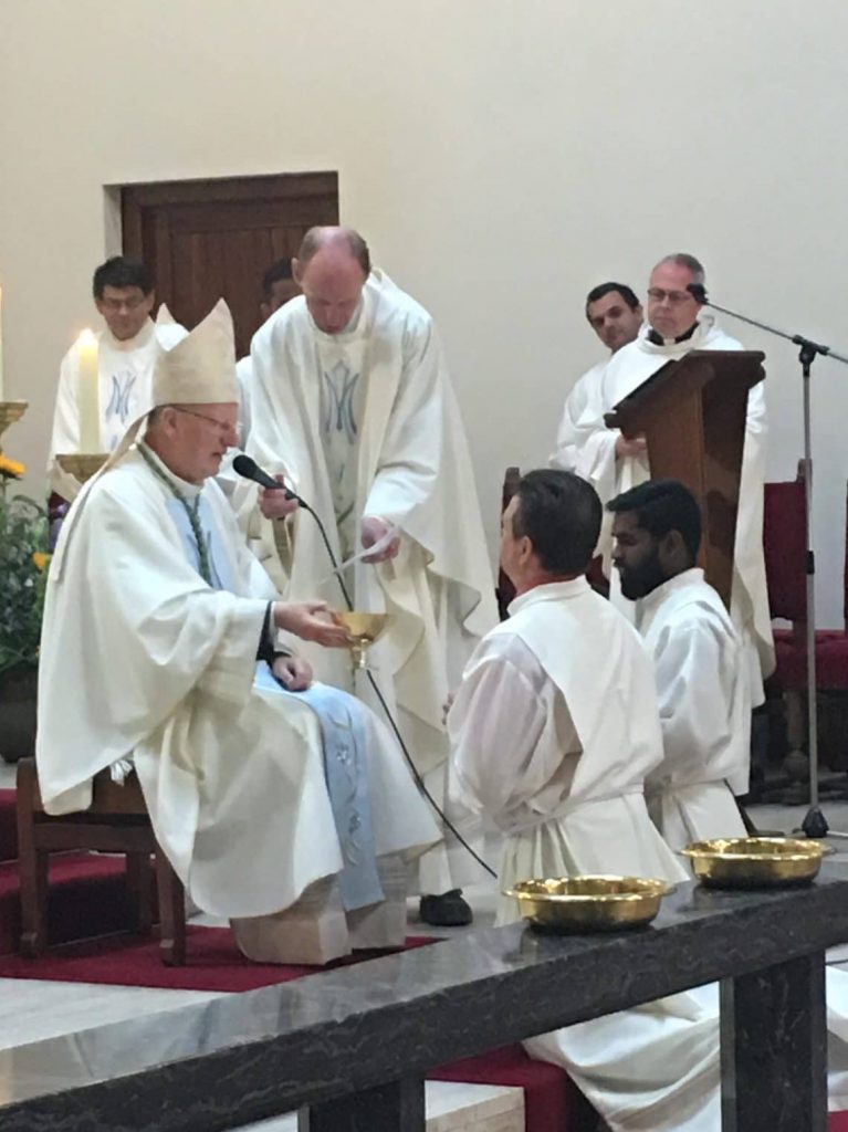 3 juli 2019Meer dan het gewone Dinsdagmorgen 2 juli is pastor Bert, tijdens de viering van het ziekentriduüm in de kapel van Onze Lieve Vrouw ter Nood in Heiloo, tot acoliet aangesteld. De viering had als thema: ‘Meer dan het gewone.’ Tijdens deze mooie viering gebeurde er dan ook meer dan gewoon! De weg die Bert naar het priesterschap aflegt bestaat uit verschillende fases. Als eerste het toelaten tot de priesteropleiding, daarna de aanstelling tot lector. Bij deze aanstelling ligt de nadruk op de lezen uit de Bijbel, het Woord van God. Nu zijn aanstelling tot acoliet, waarbij het gaat om de zorg voor het altaar en de eucharistie. Als Bert deze fase naar het priesterschap goed heeft afgelegd, en zijn laatste drie tentamens heeft gehaald, volgt de diakenwijding op zaterdag 16 november. En als alles naar wens verloopt, zal hij op zaterdag 6 juni 2020 tot priester worden gewijd. Na de verkondiging werd Bert naar voren geroepen door Mgr. Jan Hendriks. Terwijl Bert voor hem neerknielde werd hij kort toegesproken over de aanstelling tot acoliet. Ook werd de kelk hem aangereikt; het teken van de eucharistie. Bert raakte deze aan, als teken van aanvaarding. Door deze korte maar indrukwekkende ceremonie, was de aanstelling tot acoliet van pastor Bert een feit. Na afloop werden we getrakteerd op koffie met gebak en werd Bert en zijn familie gefeliciteerd. Namens alle parochianen zeggen we nogmaals: Bert proficiat, weer een stap dichterbij het priesterschap. Parochieraad Sint Victorparochie Obdam