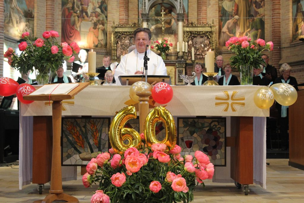 15 juni 2022Zaterdagavond 11 juni was de feestelijke viering in de Sint.Victorkerk. In een prachtig versierde kerk met pioenen van Ben Obdam en René Dekker vierde Pastor Bert zijn 60ste verjaardag. De nieuwe dirigent Co Feld van het koor Entre-Deux gaf de jarige de eer om in een prachtig solo met ‘Laudato sii, o mi Signore,’als stralend middelpunt in deze feestelijke viering voor te gaan. Na afloop van de viering ging iedereen naar de prachtig versierde pastorietuin om pastor Bert te feliciteren. Daar nam hij dankbaar de vele felicitaties en cadeaus in ontvangst. Voor iedereen was er koffie/thee met wat lekkers en daarna werd er met een drankje geproost op de jarige. Wij wensen pastor Bert nog vele gelukkige en gezonde jaren toe in onze Sint Victorparochie te Obdam. Parochieraad Sint Victor Obdam