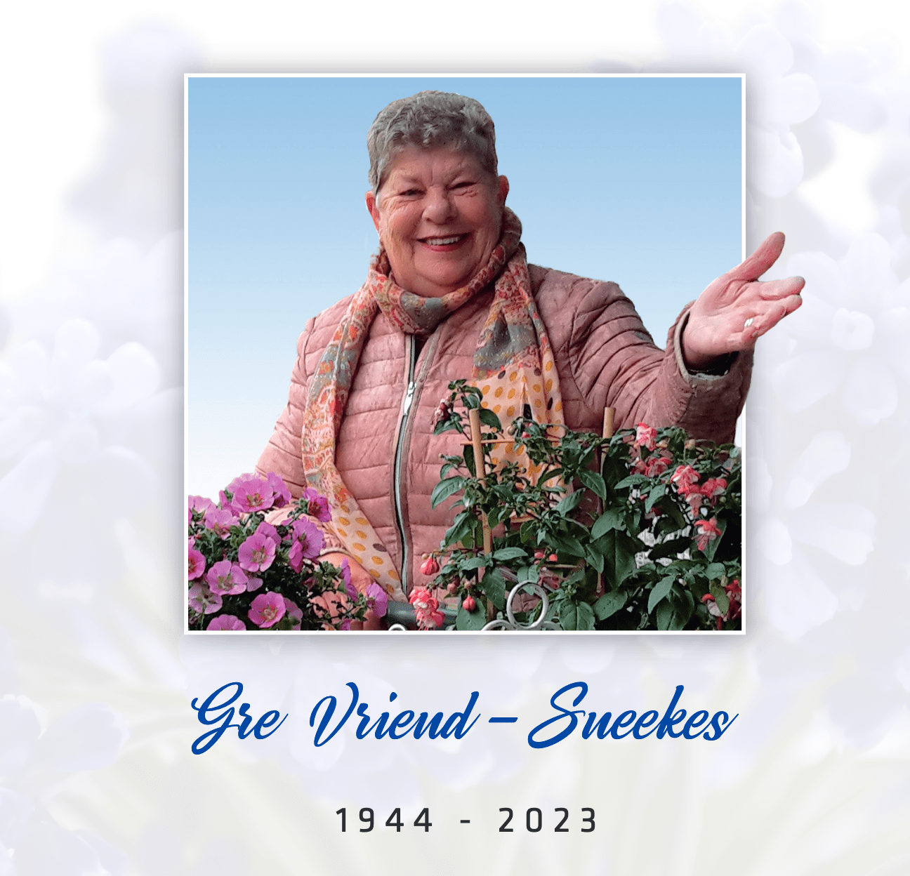 Mam is 78 jaar geleden als vierde van negen kinderen van Trien Munster en Siem Sneekes geboren aan de Obdammerdijk. Het was een echt tuindersgezin, mam vertelde altijd dat ze na school mee moest helpen op het land. In 1966 kreeg ze verkering met Arie Vriend, twee jaar later kochten ze het huis aan de Dorpstraat en trouwden ze. Wij zijn er alle drie geboren en hebben een prachtige jeugd gehad. Alles kon, alles mocht, als het maar knap ging! Vriendinnen mochten altijd blijven logeren.
