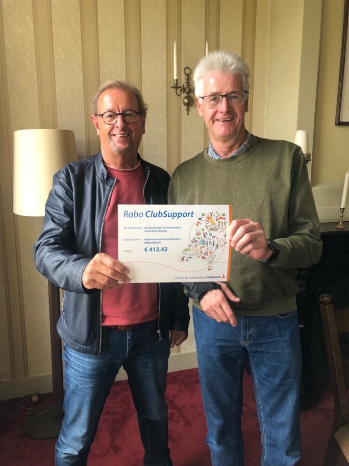 Deze keer kwam er een medewerker van de Rabobank de cheque persoonlijk overhandigen. Namens de stichting Restauratie en onderhoud Victorkerk, namen Peter Wortel en Kees Reus de cheque in ontvangst.