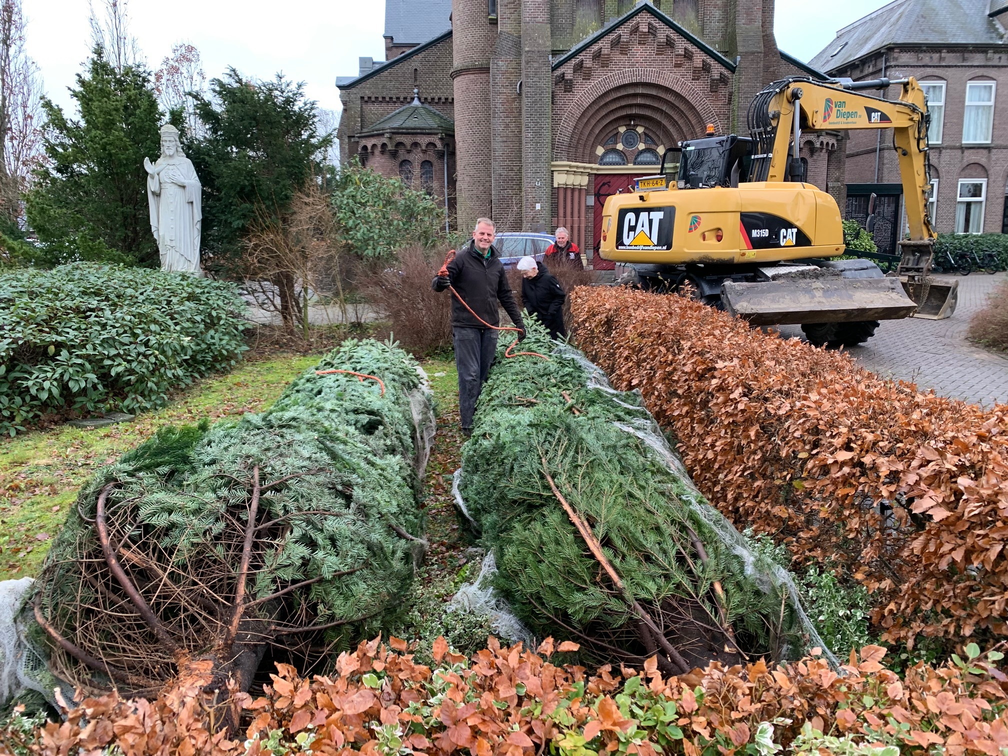 Zaterdagmorgen 9 december hebben de mannen van de kerstbomenploeg weer de grote buiten kerstbomen geplaatst. Nico Appel, Piet Klaver en Peter Smal, Jac van Diepen en Vic Obdam zijn namens de groep ondernemers, die de kerstbomen financieren, aan de slag gegaan.