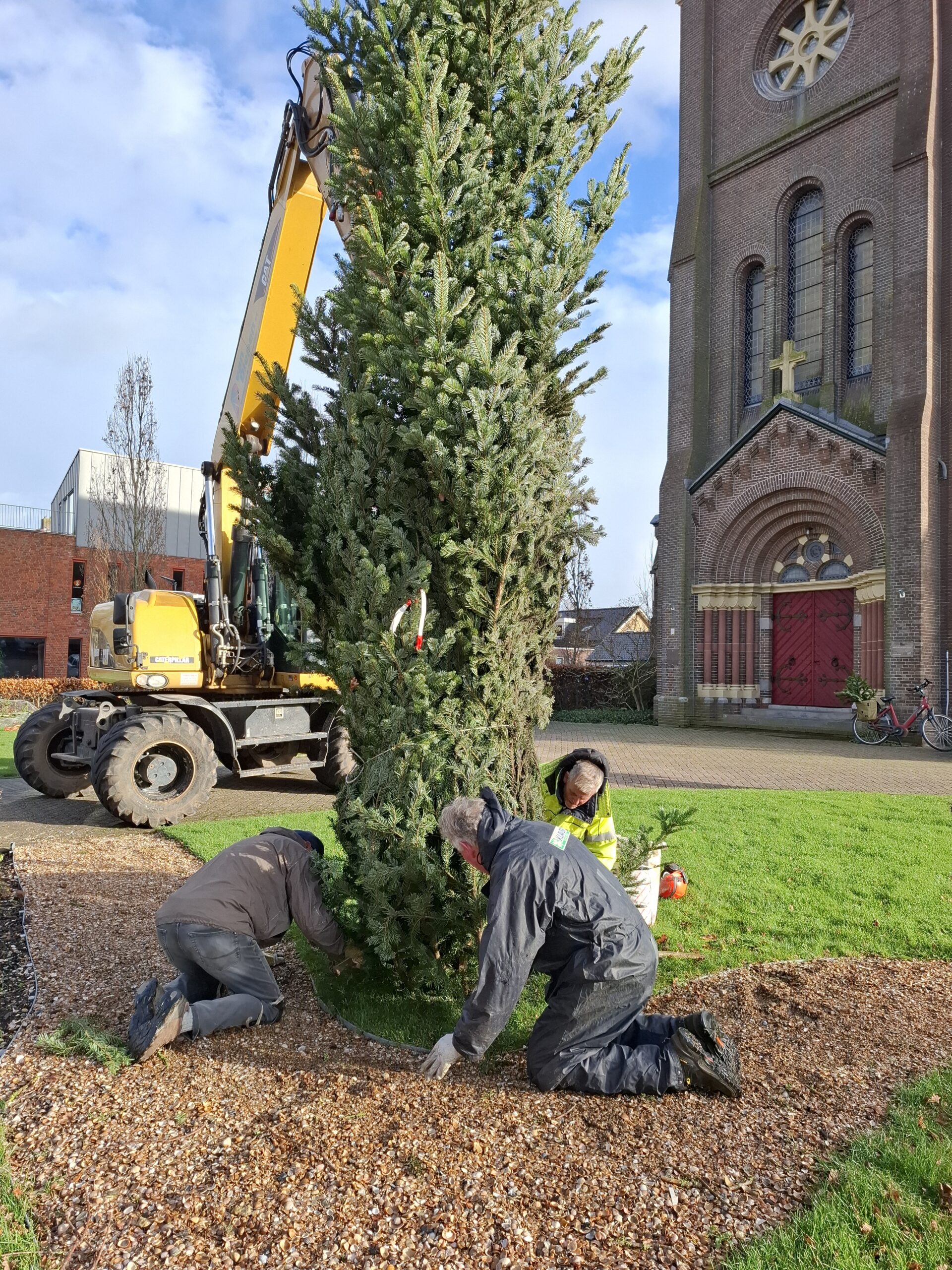 Zaterdagmiddag 7 december hebben de mannen van de kerstbomenploeg weer de grote buiten kerstbomen geplaatst. Nico Appel, Piet Klaver, Peter Smal, Jack van Diepen, George Dekker en Vic Obdam, zijn namens de groep ondernemers, die de kerstbomen financieren, aan de slag gegaan. Dit doen ze al meer dan 20 jaar!!! Met een kraan van de Loonbedrijf van Diepen die door Quinten Vriend werd bediend, was deze zware klus in ‘no time’ geklaard. Alles verliep als een geoliede machine. Maandag 9 december zijn de lichtjes door Klaver Giant Groep erin geplaatst. In onze nieuwe voortuin komen de beide kerstbomen nog beter tot hun recht, want ze staan mooi vrij en zijn van top tot teen te bewonderen.