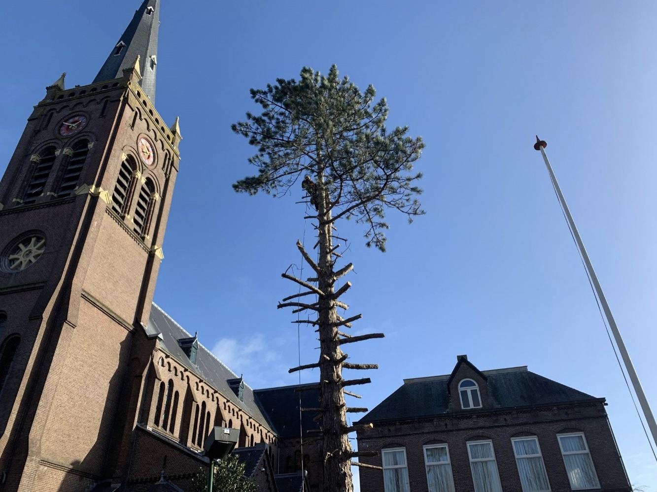 In het midden staat een grote dennenboom, maar bij nadere inspectie bleek, dat op de hoogte van 9 meter waar de boom zich in tweeden splitst, de stam van binnenuit begon te rotten. Dus deze moest om.
